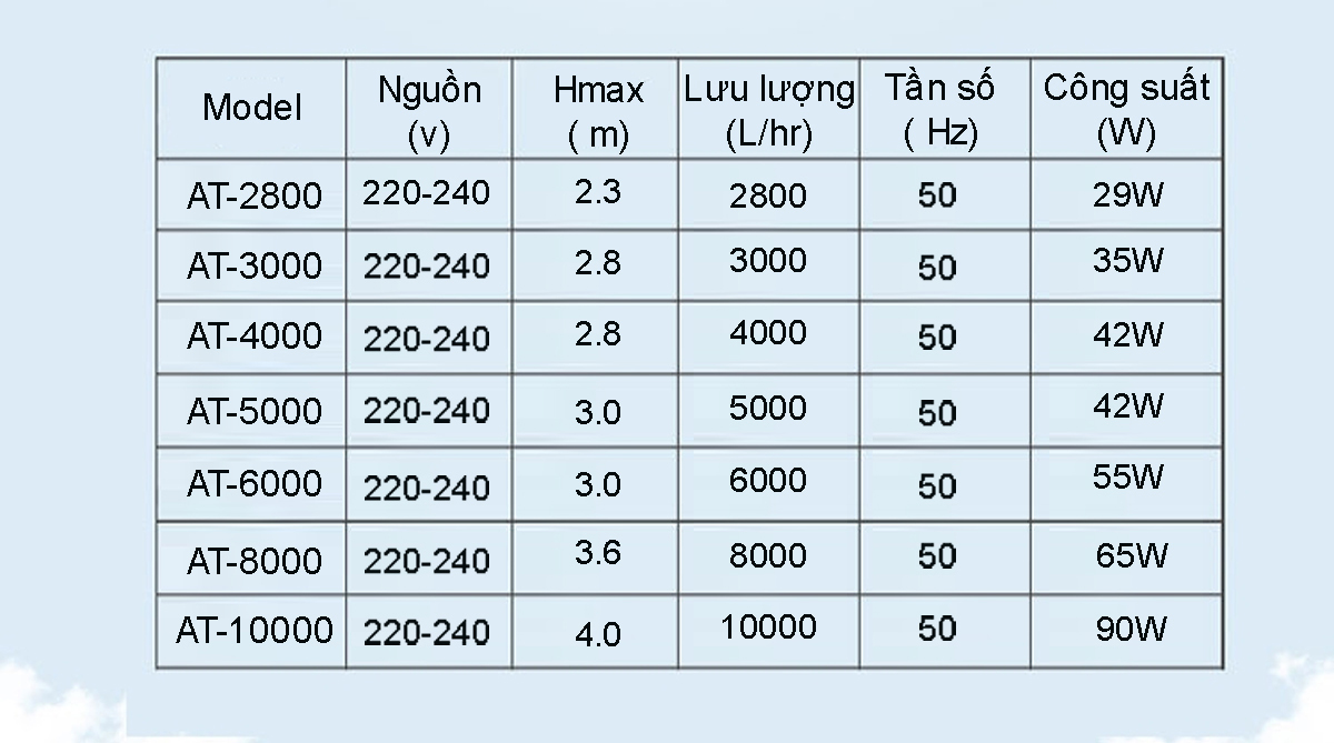Máy bơm nước ATMAN AT10000 là dòng máy bơm tiết kiệm điện đáng tin cậy và hiệu quả dùng để bơm nước, cấp nước cho các bộ lọc, ao cá, hồ cá, thác nước hoặc đài phun nước.