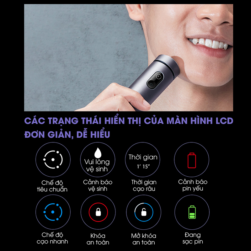 Vui lòng vệ sinh, cảnh báo vệ sinh, thời gian cạo râu, cảnh báo pin yếu, khóa an toàn…