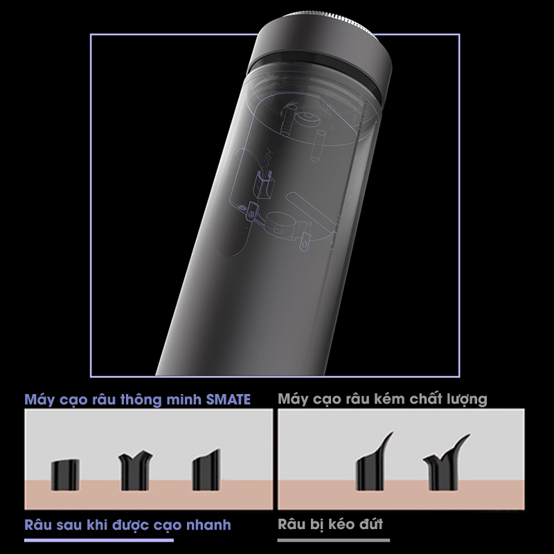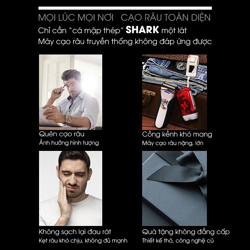 Máy cạo râu kiểu cũ cồng kềnh, khó mang theo. Không sạch lại đau rát, kẹt râu khó chịu, không đủ mạnh.