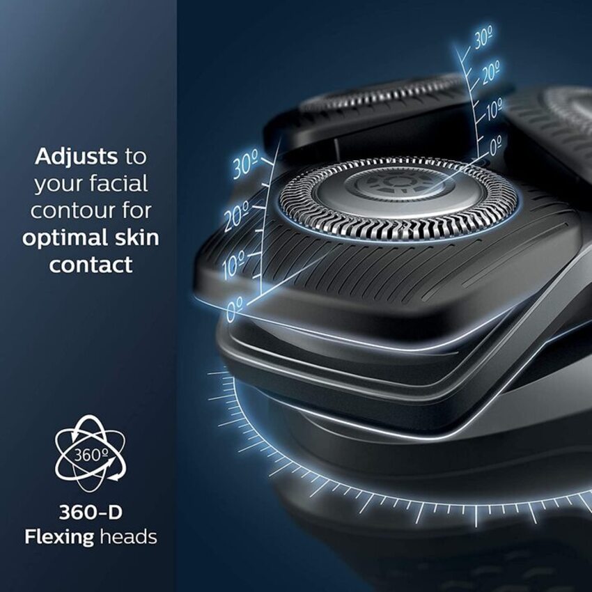 - Máy cạo râu Philips có đầu cạo hoàn toàn linh hoạt xoay 360° theo đường cong trên khuôn mặt của bạn để cạo râu thoải mái và kỹ lưỡng.