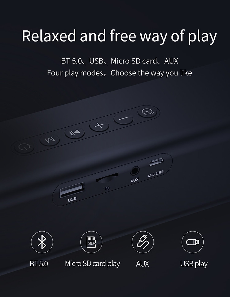 BT 5.0、USB、Micro SD card、AUX