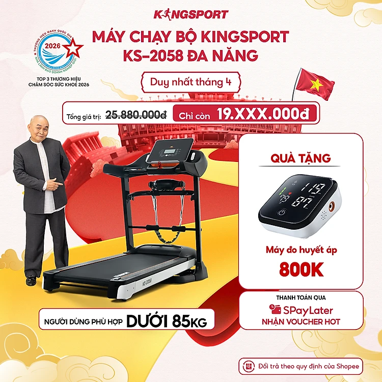 Miễn phí lắp đặt | Máy chạy bộ KINGSPORT KS-2058 đa năng, nâng dốc tự động 18%, tốc độ tối đa 18km/h, khung sườn chắc chắn, cân nặng phù hợp từ dưới 80-85kg