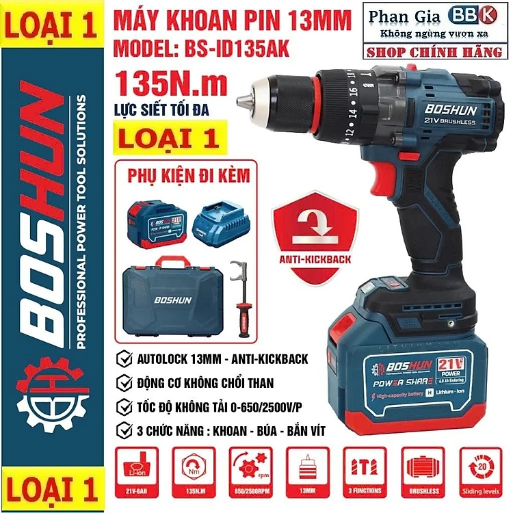 Máy [chính hãƞg] Khoan Pin BOSHUN BS-ID135AK , Anti-kickback, Động cơ Không chổi than 135Nm, 13mm, 3 chức năng