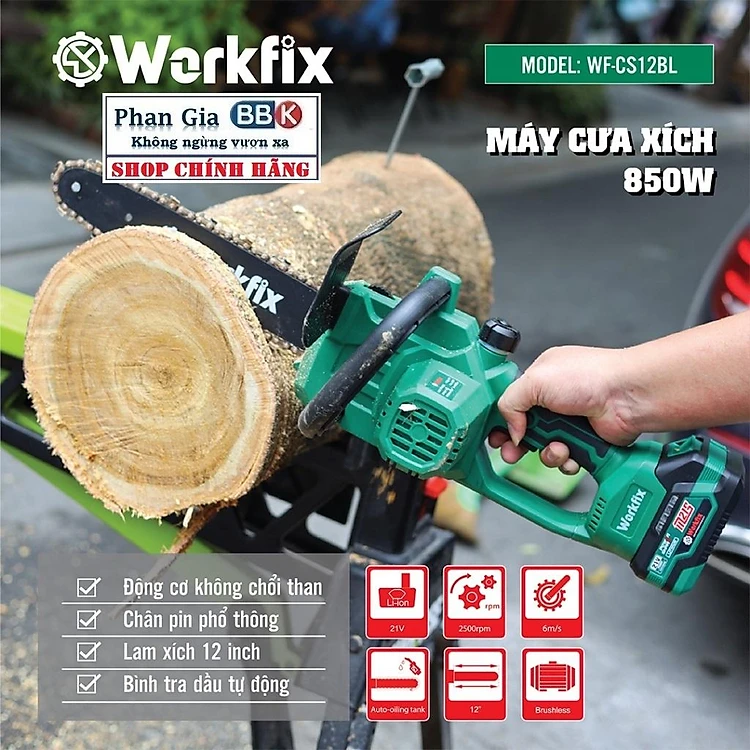Máy cưa xích pin WORKFIX 21V (WF-CS12BL) 2 Pin 15cell, Động cơ Không chổi than,Cưa Cây, Cắt Cành, Tra Dầu Tự Động