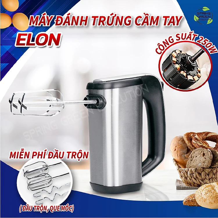Máy đánh trứng cầm tay Elon Mixer sẽ giúp bạn tạo ra những món ăn yêu thích, giúp việc chế biến món ăn trở nên dễ dàng và tiết kiệm thời gian. Máy có 2 đầu trộn (đầu trộn cánh quạt, và đầu trộn móc). Tốc độ có thể điều chỉnh lên tới 5 cấp độ. Động cơ 250W giúp máy có thể hoạt động liên tục đến 12 giờ, đáp ứng nhu cầu kinh doanh. Máy có thể trộn được nhiều nguyên liệu, xứng đáng là chiếc máy đa năng, all in one.