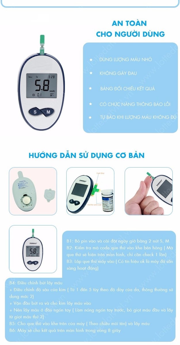 Máy đo đường huyết được thiết kế đơn giản và chính xác, tiện lợi dễ dàng kiểm tra mọi lúc mọi nơi, thiết kế với công nghệ mới phù hợp cho lối sống hiện đại và năng động giúp bạn dễ dàng theo dõi và quản lý kết quả để chia sẽ với bác sĩ của bạn, giúp họ chuẩn đoán và tư vấn cho bạn.