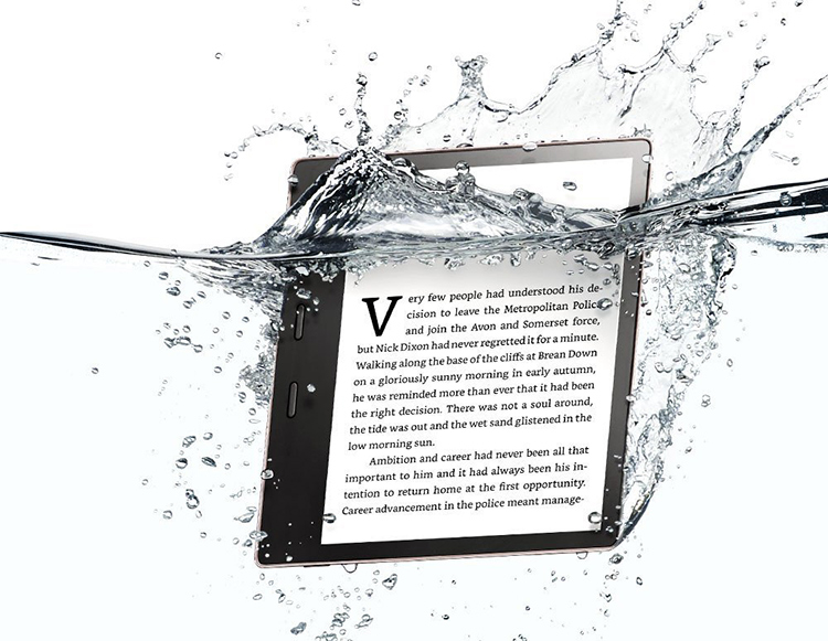 Máy đọc sách chống nước đầu tiên của Kindle, tiêu chuẩn IPX8 có thể chiu được 60 phút nếu ngâm trong nước ngọt ở độ sâu 2 mét, bạn có thể hoàn toàn yên tâm nếu bỏ quên thiết bị ở bồn rửa, hay bị mắc mưa khi di chuyển, có thể thoải mái mang máy theo trong các chuyến du lịch hay nghỉ dưỡng, đọc sách ở bể bơi, thưởng thức cuốn sách khi đang ngâm mình trong bồn tắm, điều đó còn gì tuyệt vời hơn.