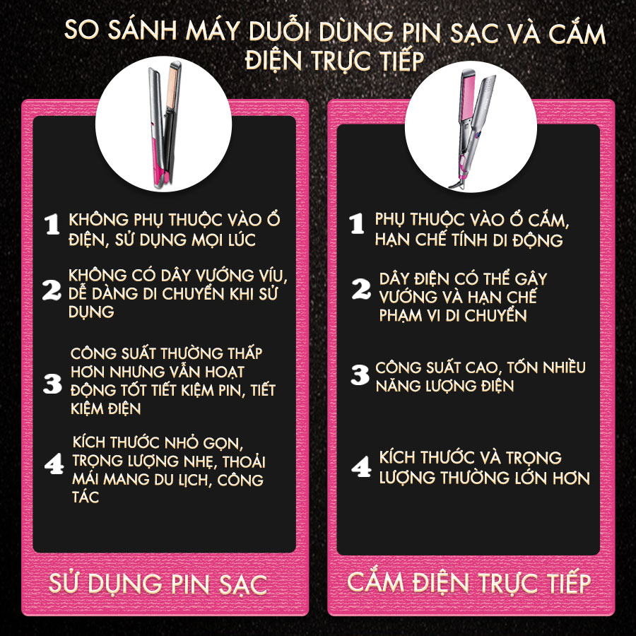 Máy duỗi tóc không dây: Phù hợp cho người thường xuyên di chuyển, cần tính tiện lợi, gọn nhẹ và không phụ thuộc vào nguồn điện. Tuy nhiên, cần chú ý đến thời gian sạc và dung lượng pin.
