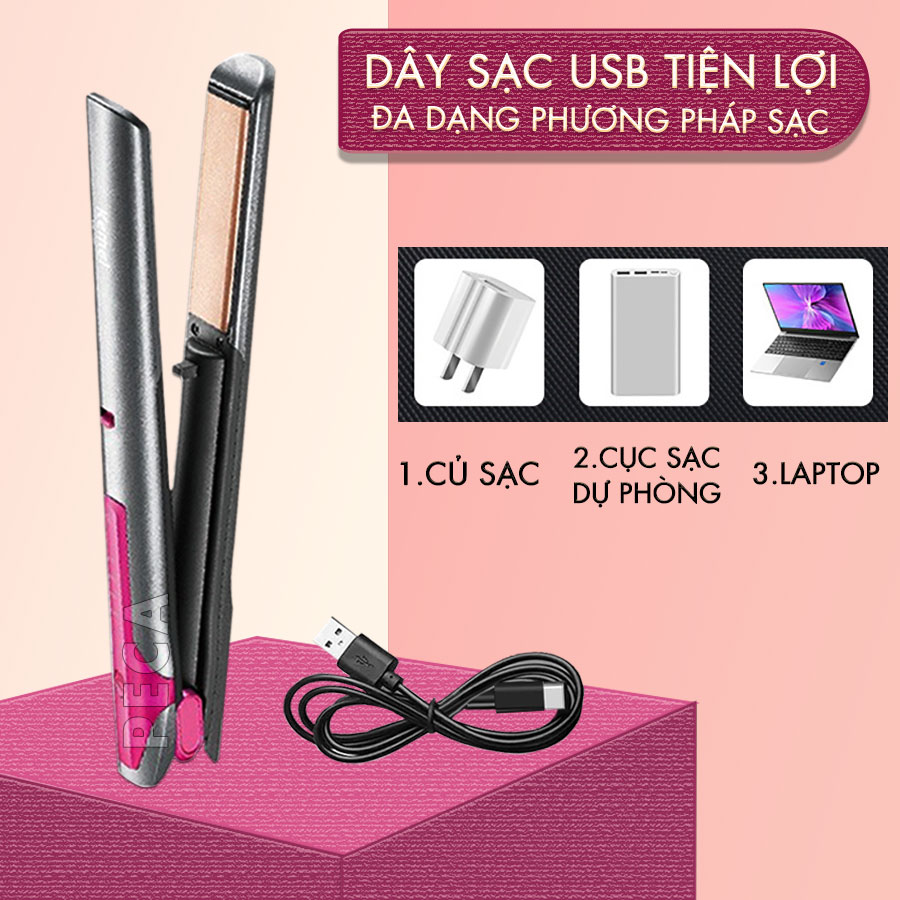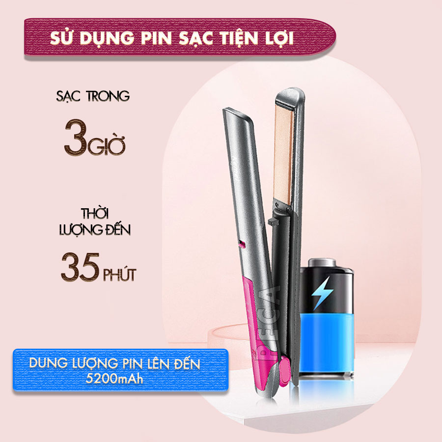 Máy duỗi tóc không dây được trang bị pin sạc USB tiện lợi cho thời gian sạc chỉ 3 giờ, thời gian sử dụng 35 phút. Thời gian sạc tương đối này là nhờ vào công nghệ sạc nhanh, giúp tiết kiệm thời gian và tăng tính tiện lợi cho người dùng.