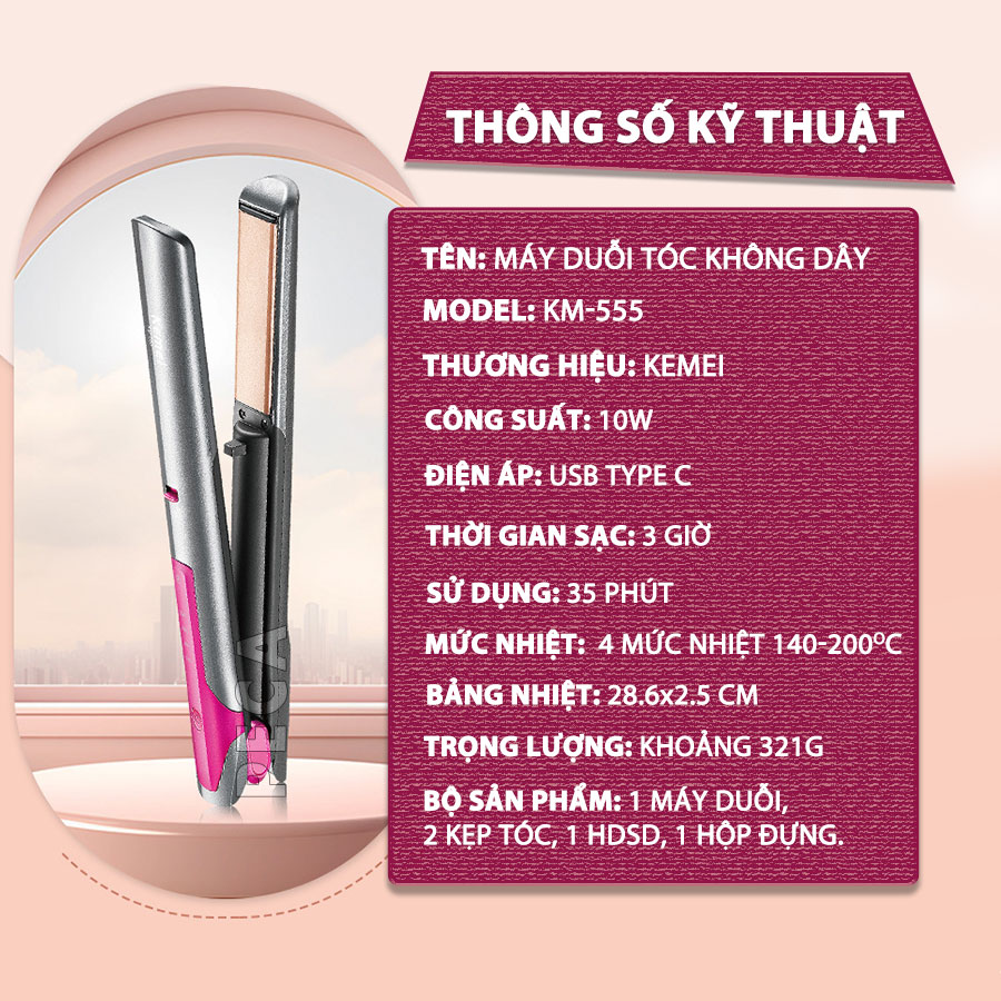 So với những dòng máy duỗi truyền thống khi sử dụng cần phải có nguồn điện trực tiếp thì máy duỗi tóc không dây Kemei KM-555 chính là lựa chọn hoàn hảo, mang đến khả năng tạo kiểu tóc một cách nhanh chóng, tiện lợi và hiệu quả ở bất cứ đâu mà không cần nguồn điện trực tiếp. Với thiết kế nhỏ gọn, tính năng sạc USB linh hoạt và khả năng điều chỉnh nhiệt độ phù hợp với mọi loại tóc, Kemei KM-555 là người bạn đồng hành lý tưởng, giúp bạn luôn có mái tóc đẹp dù ở bất kỳ đâu, đặc biệt phù hợp với người thường xuyên di chuyển và cần sự nhanh chóng, tiện lợi.