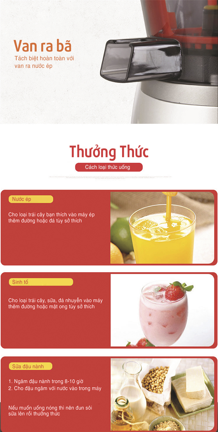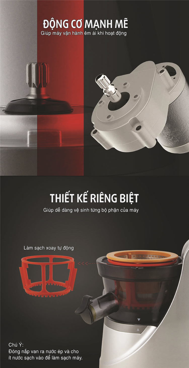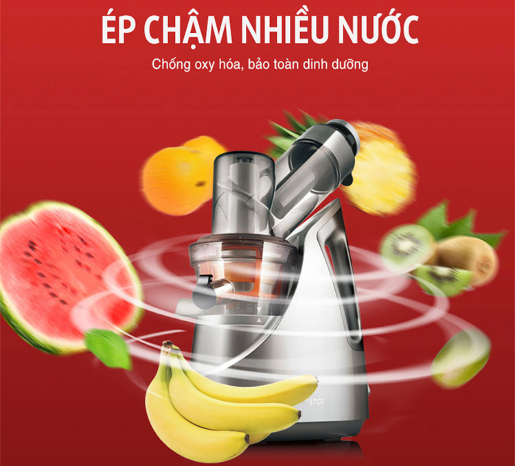 Máy ép chậm chính hãng được ứng dụng công nghệ ép nước bằng trục vít, tỉ lệ nước ép nhiều hơn 55%, lực vắt lớn ép khô xác trái cây. JYZ-V88 có khả năng ép nhiều nước, chống oxy hóa mang đến hương vị nguyên chất cho bạn thưởng thức. Cùng với thiết kế riêng biệt, giúp dễ dàng vệ sinh từng bộ phận của máy.