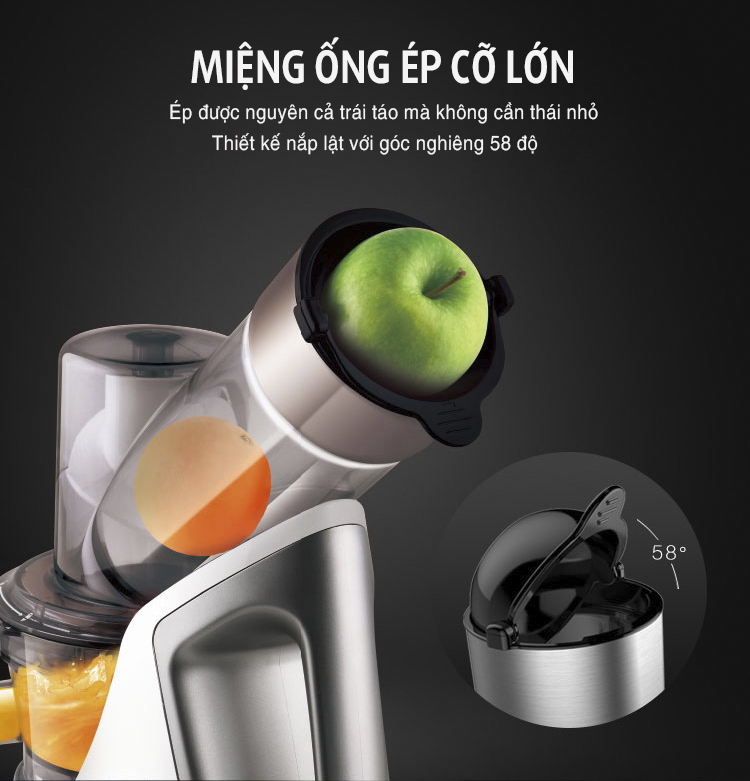 Máy Ép Chậm Joyoung JYZ-V88 là dụng cụ giúp bạn có thể dễ dàng chuẩn bị được các loại nước ép trái cây ngon lành và bổ dưỡng nhất cho gia đình và bạn bè của bạn, trong khoảng thời gian ngắn nhất. Thiết kế miệng ép có đường kính lớn, cấu tạo nắp lật góc nghiêng 58 độ, giúp bạn dễ dàng ép cả nguyên trái táo mà không cần tốn công thái nhỏ.