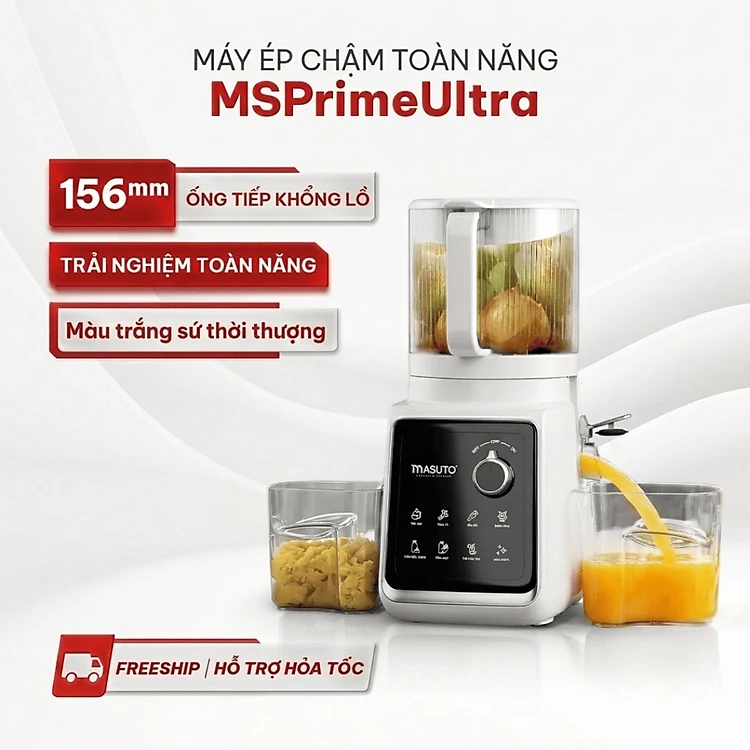 Máy Ép Chậm Trái Cây Làm Kem Toàn Năng 8in1 Masuto MSPrimeUltra, Công Suất 150W, Ống Tiếp Cực Đại 156mm, Ép Kiệt 99%, 8 Chế Độ Nấu - Hàng chính hãng