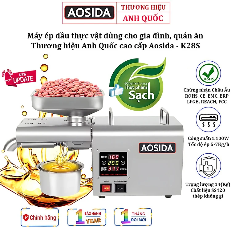 Máy ép dầu thực vật dùng cho gia đình AOSIDA K28S Thương hiệu Anh Quốc cao cấp, Công suất 1100W, 1 giờ ép 5-7.5 kg nguyên liệu - Hàng nhập khẩu