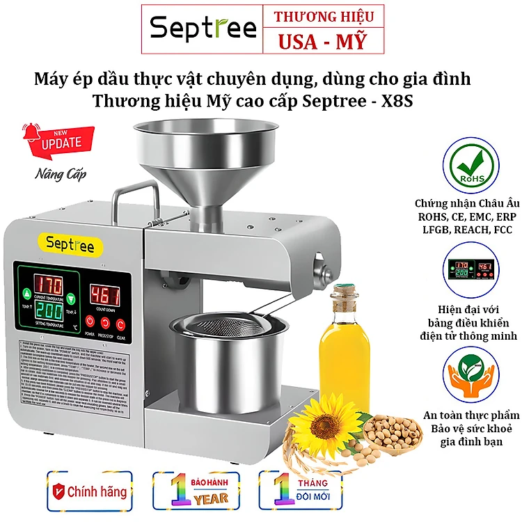 Máy ép dầu thực vật Septree X8S dùng trong gia đình Thương hiệu Mỹ, Ép 4-6kg/1 giờ - Hàng Nhập Khẩu, Bảo Hành 1 Năm