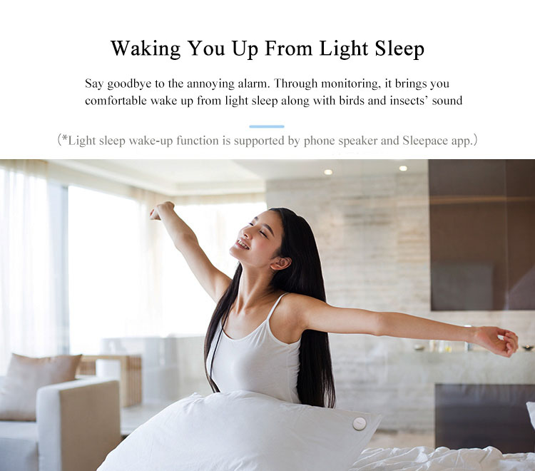 • Sleepace APP hỗ trợ giấc ngủ ngon bằng những âm thanh êm dịu của sóng nước, mưa rơi ngoài cửa sổ hoặc lửa trại tí tách đem lại cho bạn cảm giác an toàn, yên tĩnh khi tiến vào giấc ngủ và đánh thức bạn vào sáng hôm sau với âm thanh nhẹ nhàng bình yên của chim chóc, côn trùng.