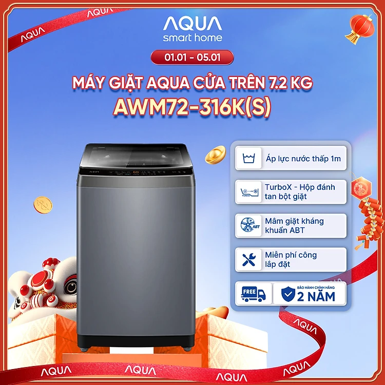 Máy giặt Aqua 7.2 kg AWM72-316K(S) - Bảo hành 2 năm - Hỗ trợ lắp đặt - Hàng chính hãng