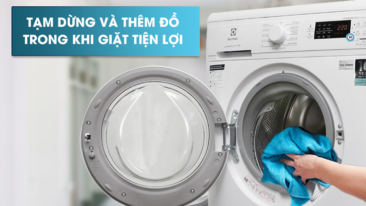 Ngoài ra, máy giặt Electrolux còn trang bị tính năng thêm đồ trong khi giặt. Với tính năng này, bạn sẽ được phép thêm đồ giặt còn sót trong lúc máy đang vận hành vô cùng tiện lợi và thân thiện.