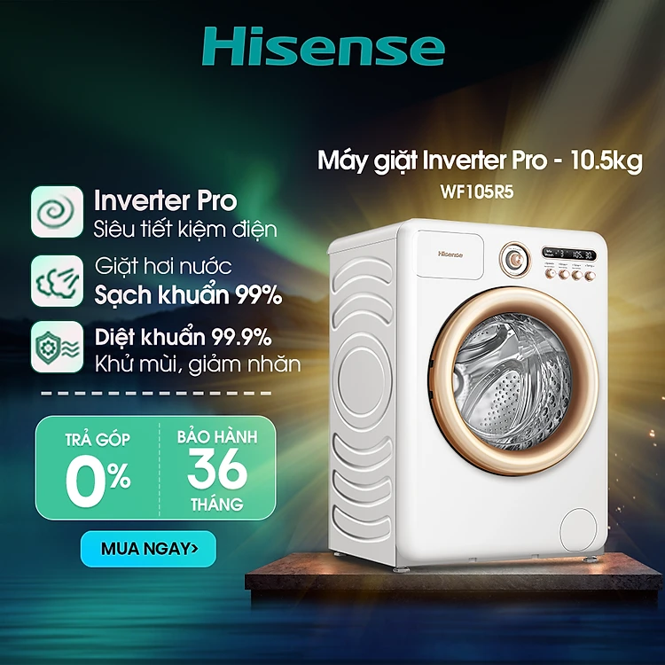 Máy giặt Hisense 10.5kg Inverter Pro WF105R5 Diệt khuẩn Khử mùi 99.9%, Ngừa dị ứng, Giặt AI - HÀNG CHÍNH HÃNG