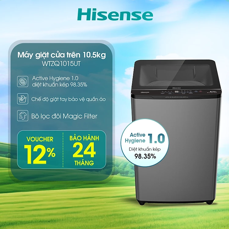 Máy giặt Hisense cửa trên WTZQ1015UT 10.5kg bộ lọc xơ vải kép, bảo hành 3 năm - HÀNG CHÍNH HÃNG
