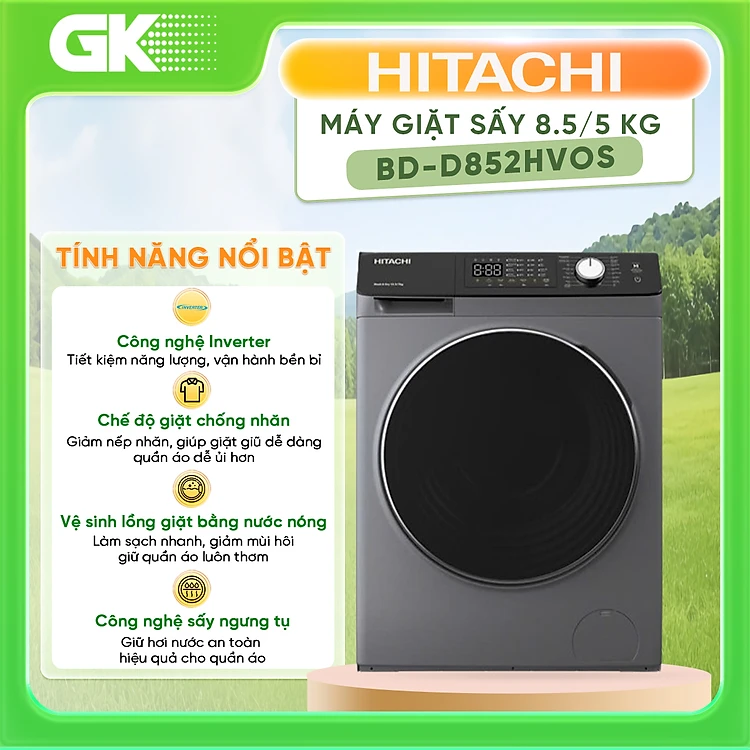 Máy giặt lồng ngang Hitachi Inverter 8.5Kg sấy 5Kg BD-D852HVOS - Hàng chính hãng