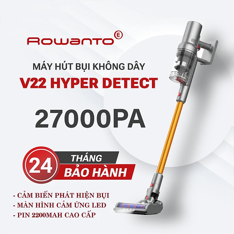 Máy hút bụi cầm tay Rowanto V22 Hyper Detect Công Suất Cực Mạnh 27000PA, Màn hình LED Lực hút tự điều chỉnh, Cảm biến tự động phát hiện bụi