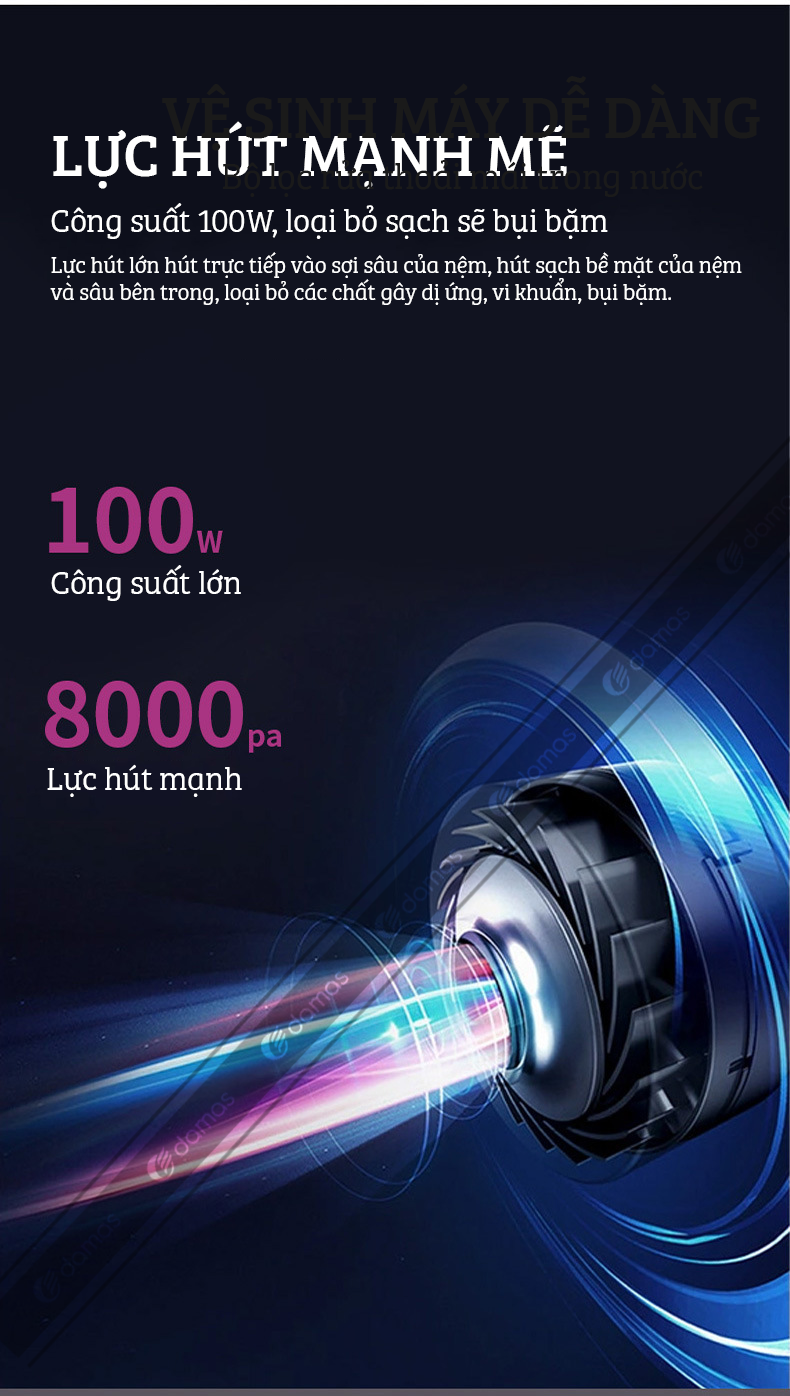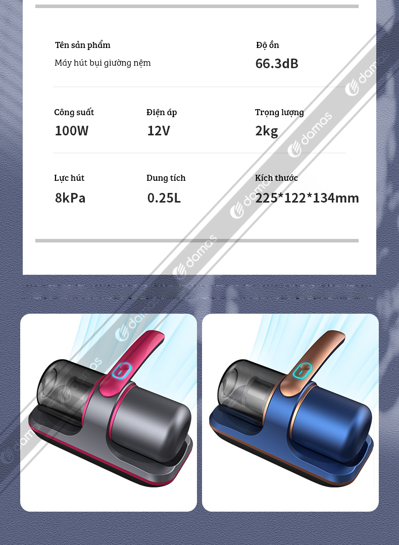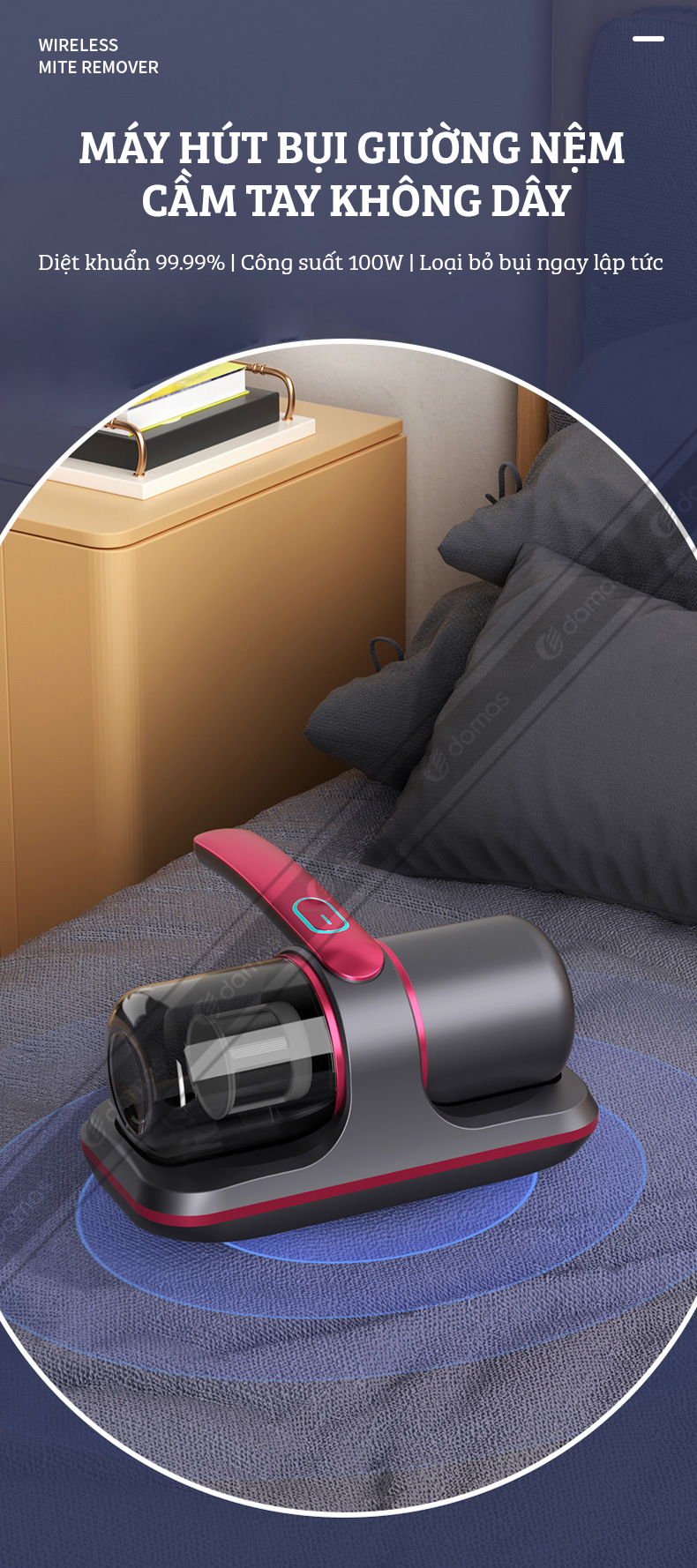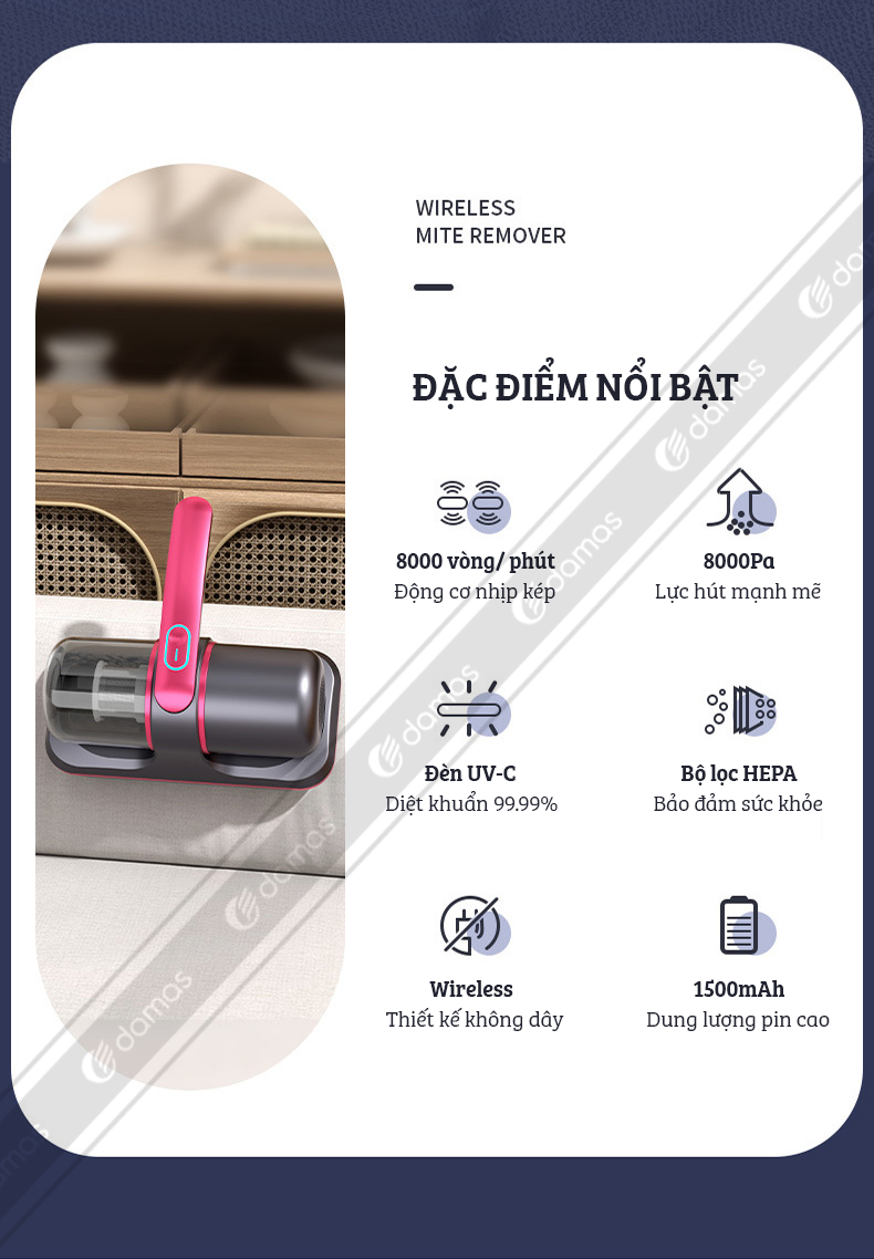 Máy Hút Bụi Cầm Tay Không Dây Damas MY017 - Hút Bụi Giường Nệm Diệt Khuẩn Bằng Tia UV Kết Hợp Tạo Xung Nhịp Tiêu Diệt Lên Đến 99,9% Vi Khuẩn Gây Hại Có Trên Giường Nệm, Sofa - Lực Hút Mạnh Mẽ Lên Đến 12.000PA - Bảo Hành 12 Tháng - Hàng Chính Hãng