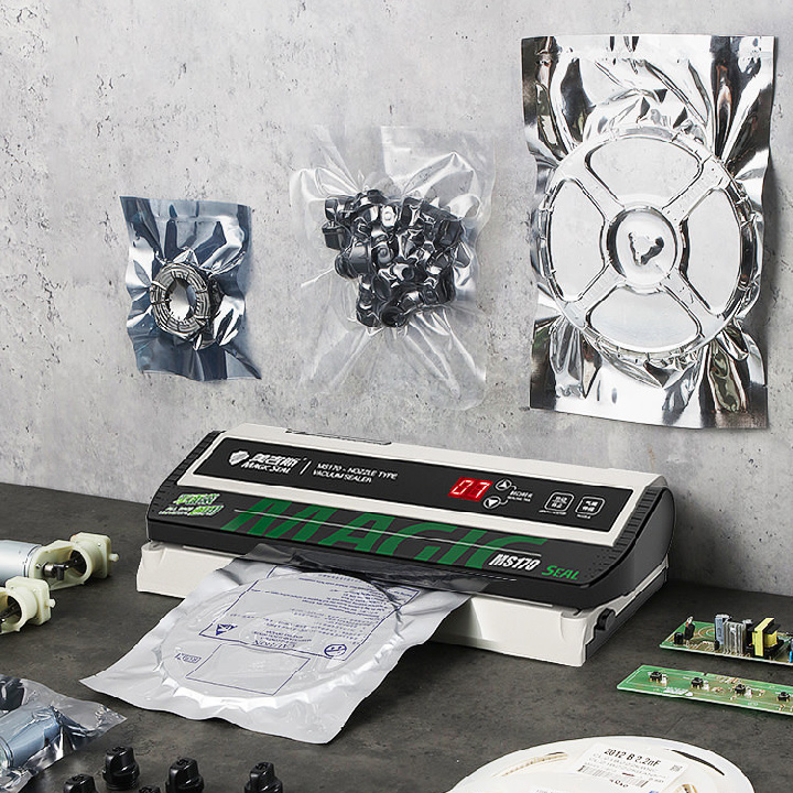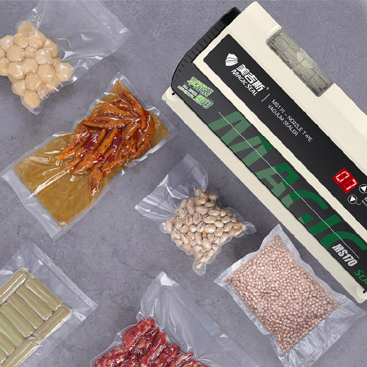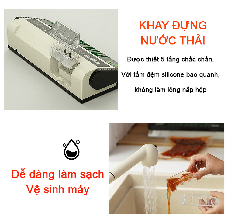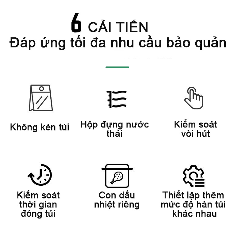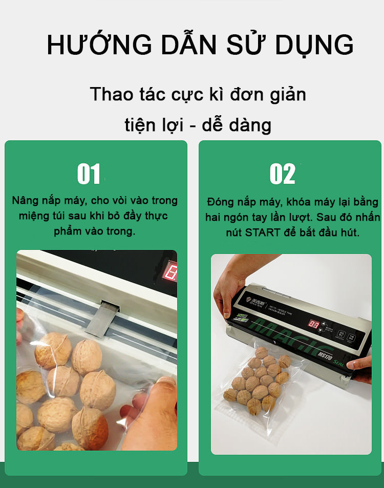 Với cơ chế hút bằng vòi hút nằm bên ngoài - máy hút được hầu hết các loại túi, bao bì đựng thực phẩm trên thị trường.