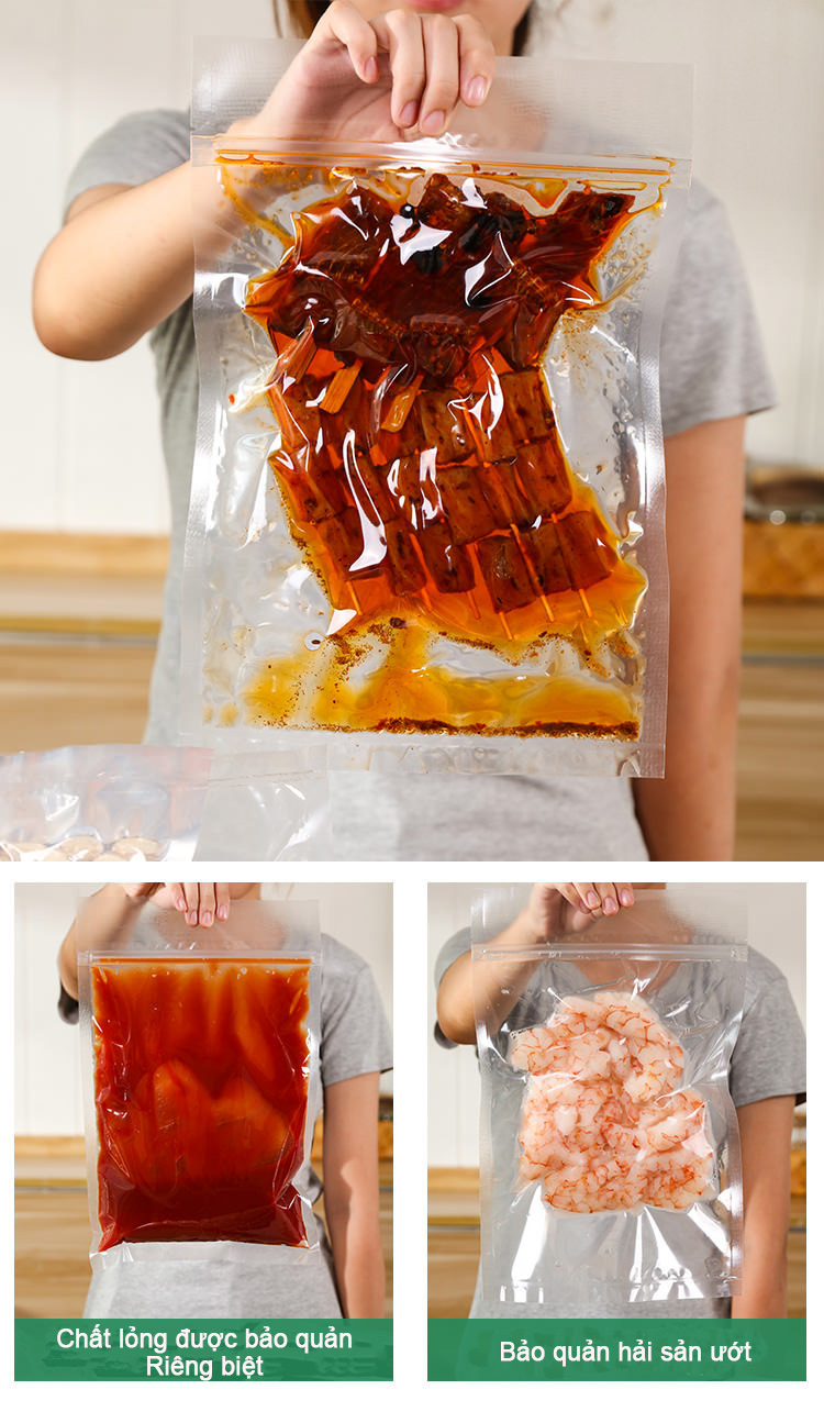 - Một số loại thực phẩm phổ biến được đóng chân không: Hải sản, thịt tươi, chả cá, chả giò, xúc xích, măng tươi, măng khô, thực phẩm khô như chè, gạo, hạt điều, cà phê, ngũ cốc, mứt, ruốc, thịt khô, nem, 90% các loại thực phẩm đều có thể được bảo quản trong môi trường chân không.