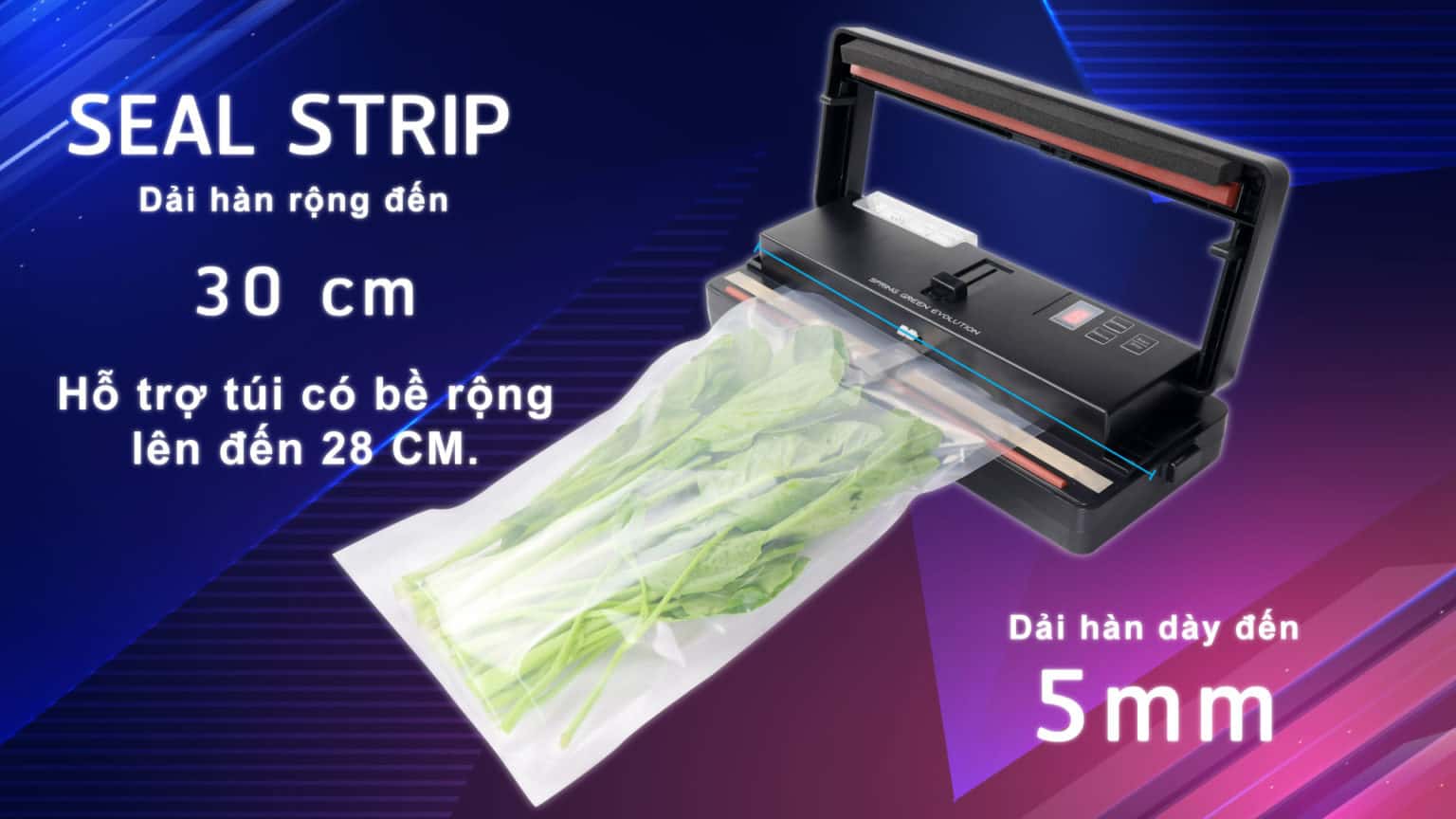 - Dải hàn dày đến 5mm và rộng 30cm, hỗ trợ hàn túi kích thước lớn