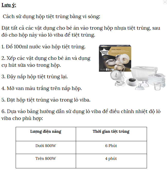 - 1 Hộp đựng tiệt trùng: Giúp bạn làm sạch các dụng cụ hút sữa một cách an toàn. Chất liệu chịu nhiệt có thể sử dụng trong lò vi sóng.