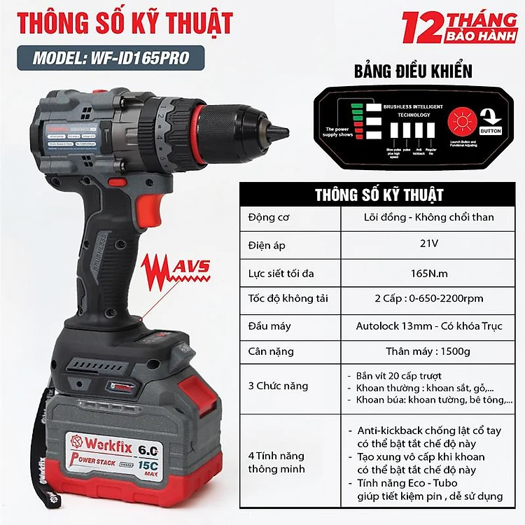 Máy Khoan 3 Chức Năng 165N.m Workfix - WF-ID165PRO - Đầu Kẹp 13mm Auto Lock - Anti Kickback - Có Tạo Xung Vô Cấp - Tính Năng Eco-Tubo - Brushless Motor - Chân Pin Phổ Thông - 2 Pin 15 Cell - Có Tay Cầm Trợ Lực