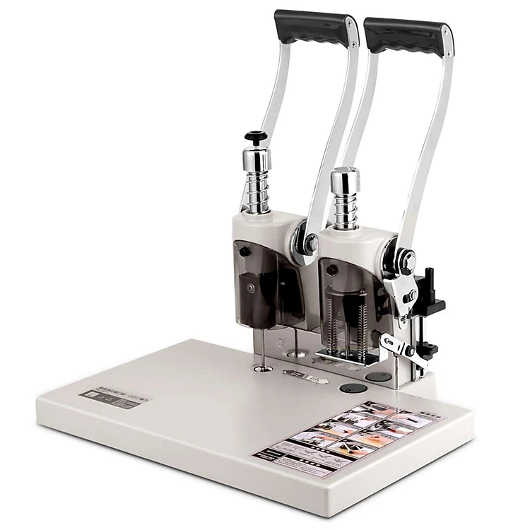 - Mỗi lần, máy có thể đóng đến độ dày tối đa là 38mm, tương đương 450 tờ giấy ĐL 70gsm. Đường kính lỗ đóng là 5,2mm, phù hợp với nhiều khổ giấy khác nhau. Máy sử dụng nguồn điện 220V/2A/50Hz với mũi khoan sắc nhọn, khoan nhanh dứt khoát, không làm xơ rách lỗ khoan.