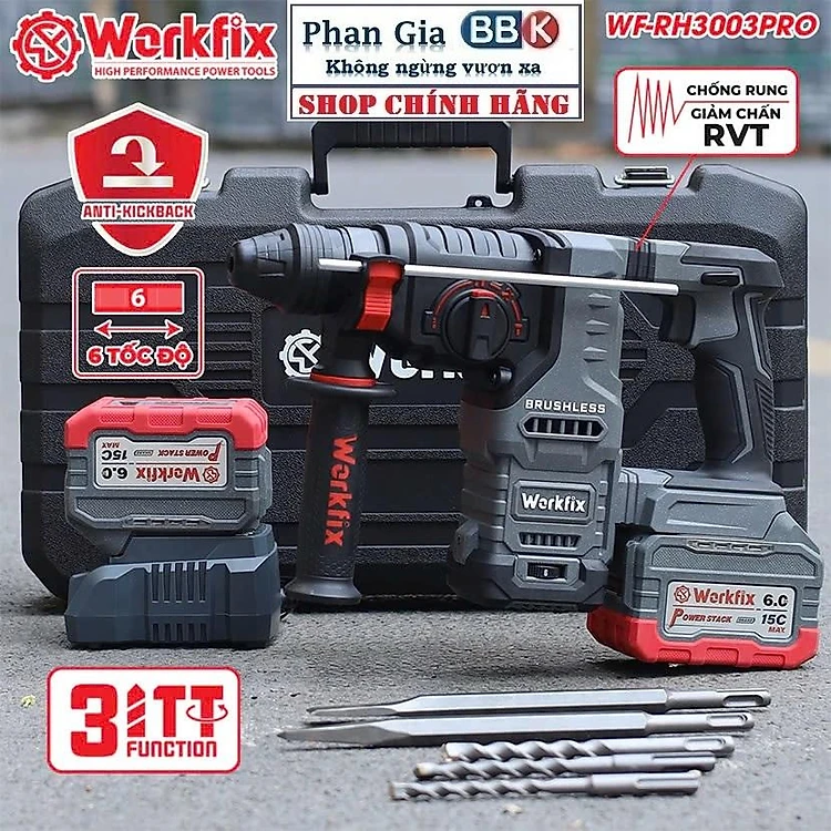 Máy khoan đục bê tông pin WORKFIX WF-RH3003PRO, Anti-kickback, giảm rung chấn RVT, 3 chức năng, 6 tốc độ