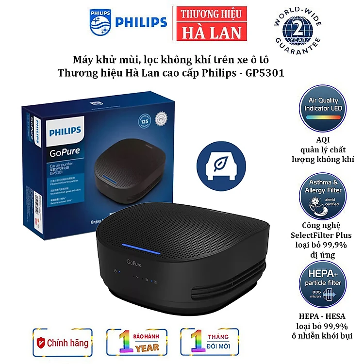 Máy khử mùi, lọc không khí trên xe ô tô Philips GP5301 - Cảm biến chất lượng không khí: 3 màu AQI - HÀNG NHẬP KHẨU