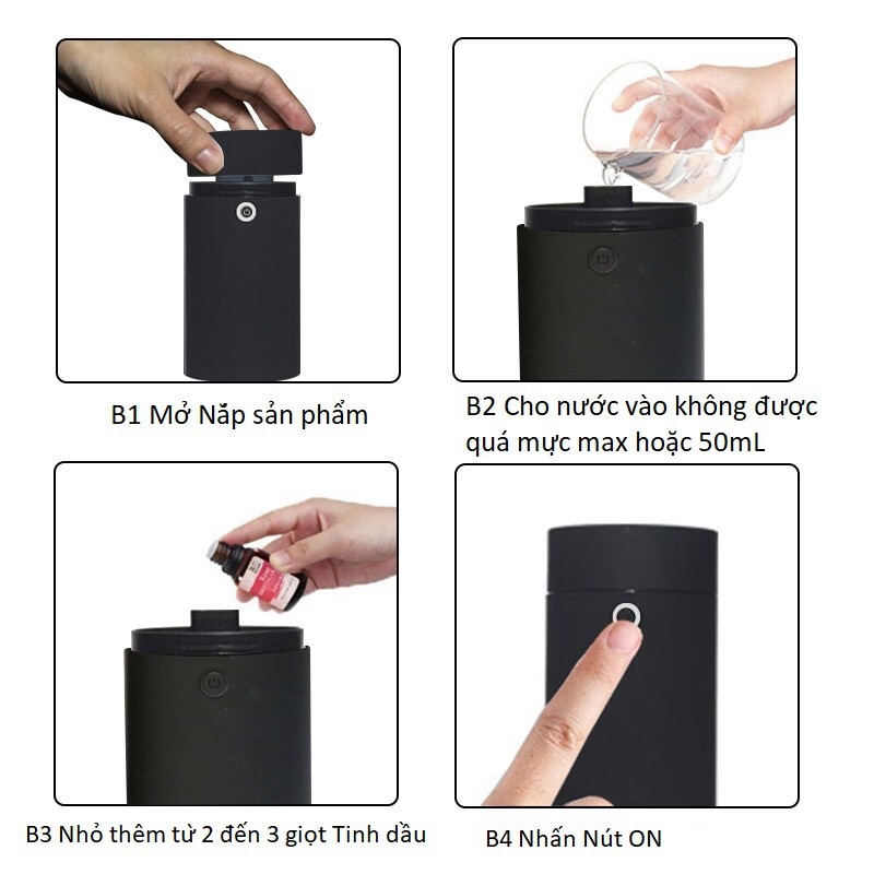 HƯỚNGDẪN SỬ DỤNG ️Bước 1: Mở nắp ngoài cùng của máy ️Bước 2: Đổ nước vào khoang chứa bên trong máy (Lưu ýkhông đổ quá vạch,hoặc quá ít máy sẽ không phun, tránh làm tràn nước ra bênngoài ) ️Bước 3: Nhỏ 5 đến 7 giọt tinh dầu vào phần nước trongkhoang chứa ️Bước 4: Đậy nắp nắp lại như cũ ️Bước 5: Cắm dây nguồn và bật nút khởi động