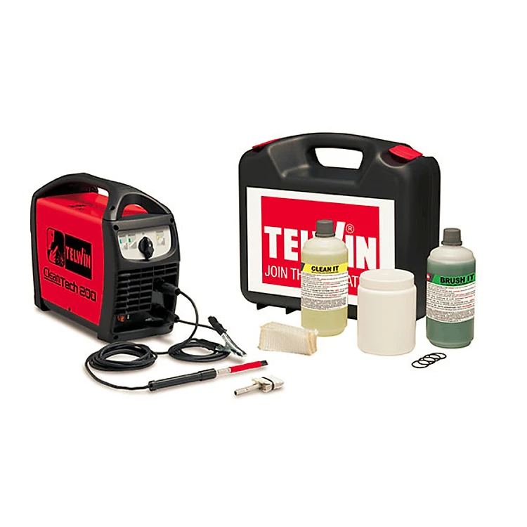 • Máy làm sạch mối hàn Telwin CLEANTECH 200 sử dụng nguồn điện áp 1 pha 230V, hoạt động theo nguyên lý làm sạch mối hàn TIG và hàn MIG trên inox nhờ phản ứng hóa học điện tử tức thời, độ bóng của thép không gỉ nó sẽ được khôi phục bằng cách nhanh chóng loại bỏ các oxít tạo màu hình thành trong quá trình hàn.