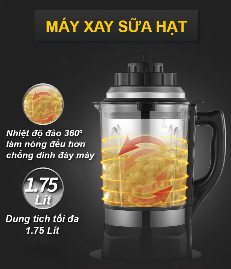 Trong lúc hoạt động chế biến thực phẩm, máy sẽ tiến hành đảo chiều 360 độ liên tục giúp các loại hạt được làm nóng nhanh & điều hơn, bên cạnh đó giúp chống dính thực phẩm ở lớp đáy máy, thành phẩm thêm thơm ngon hơn. Thêm vào đó, cối xay có dung tích 1.75 lít, cho phép bạn xay nhỏ & chế biến được nhiều thực phẩm hơn với chỉ một lần máy hoạt động.