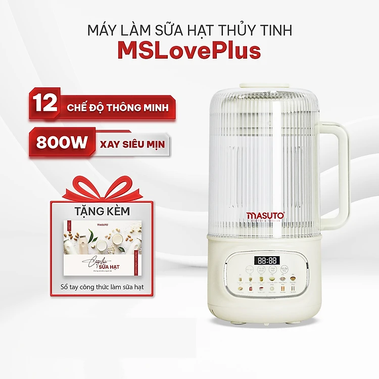 Máy làm sữa hạt thủy tinh chống ồn Masuto MS Love Plus dung tích 1,2L có hẹn giờ 12 chế độ nấu - Hàng chính hãng