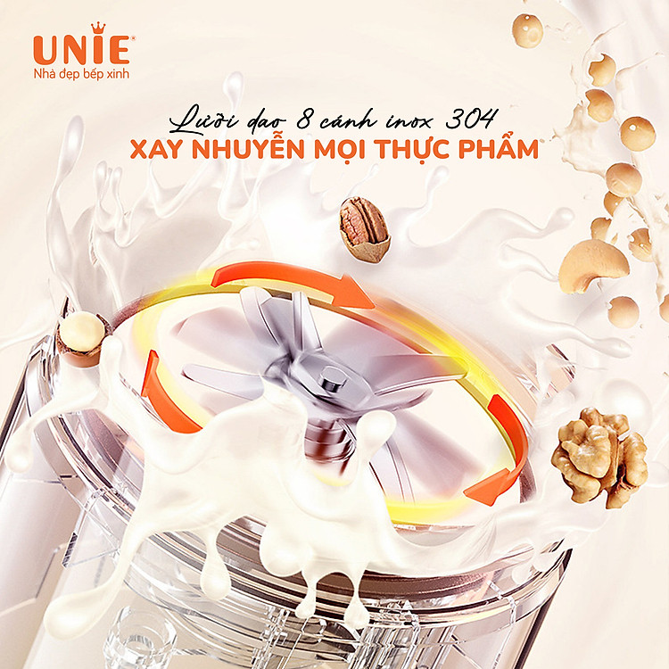 Cải tiến mới nhất trên phiên bản Unie VX với lưỡi dao inox 304 8 cánh. Kết hợp với công suất xay nấu mạnh mẽ để xay nhuyễn các loại hạt, tạo ra những ly sữa hạt thơm ngon sánh mịn.