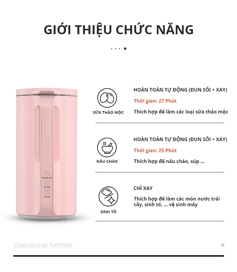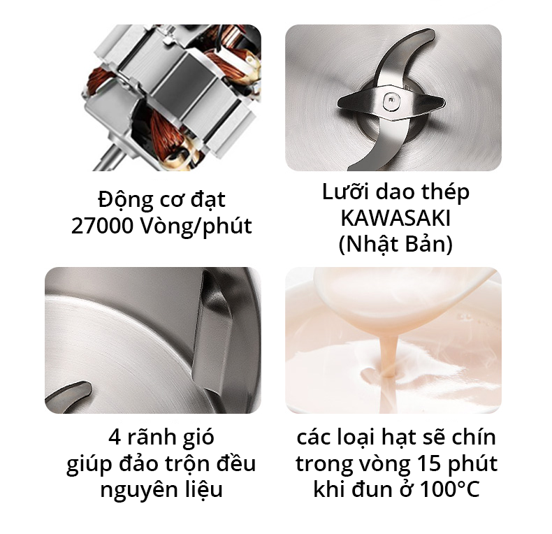 Nấu sữa hạt tự động chỉ với 23 phút. Dung tích 350ml. 27000 vòng/phút siêu êm, siêu mịn. Tự vệ sinh máy chỉ với một nút nhấn