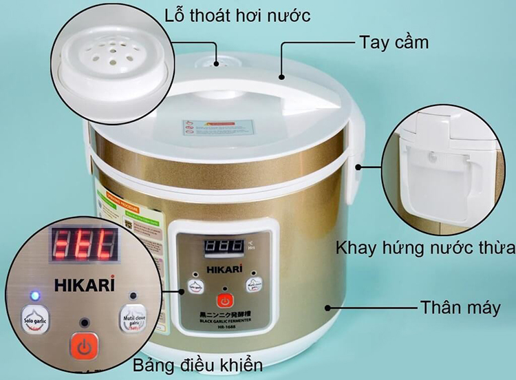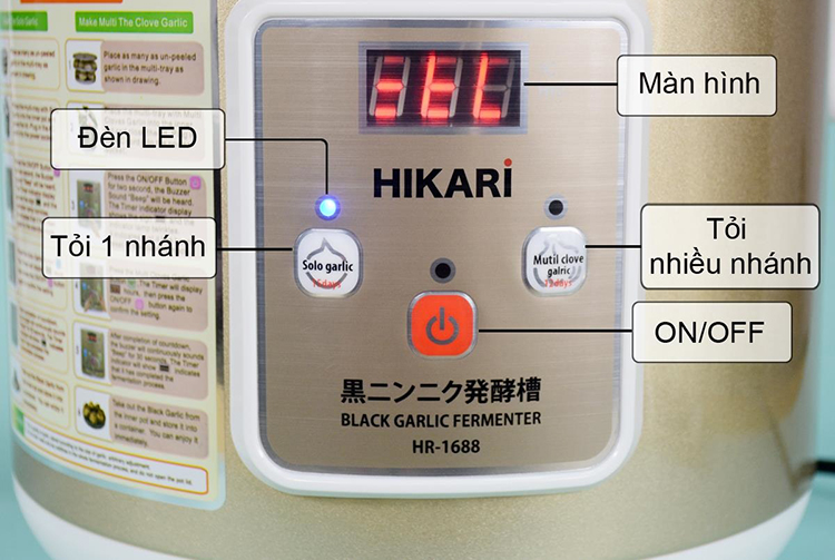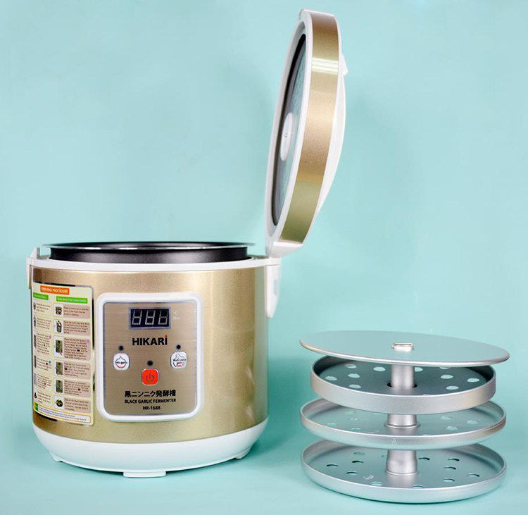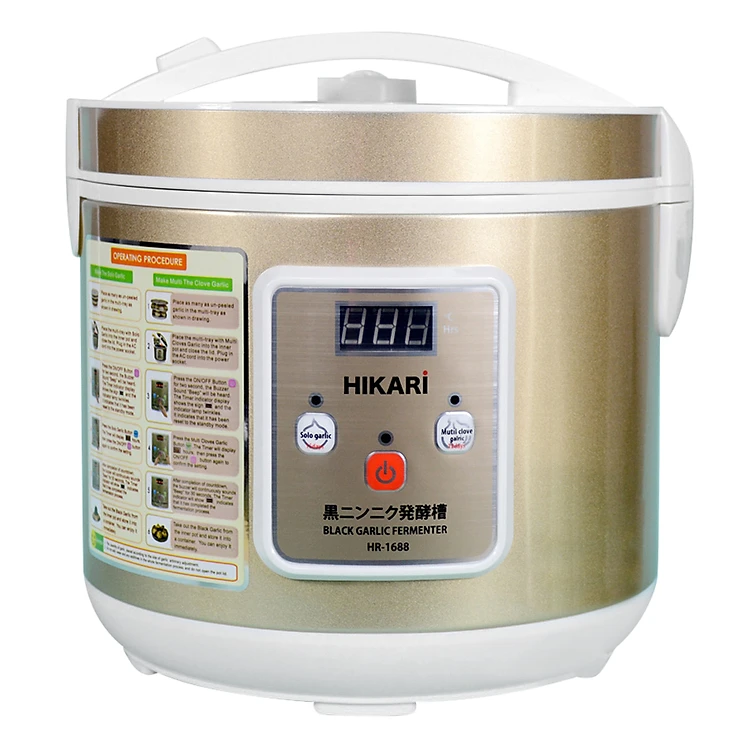 Máy làm tỏi đen Hikari HR-1688 sản xuất trên dây chuyền công nghệ Nhật Bản, thiết kế hệ thống phát nhiệt 3 chiều 360, được điều khiển bởi bản mạch điện tử cho dòng khí tuần hoàn quanh nồi giúp tỏi đen lên men nhiều nhất và bớt đi thao tác đảo tỏi trong quá trình lên men cho người dùng.