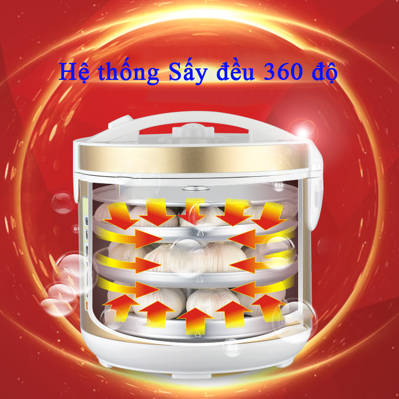 - 3 khay đựng tỏi có thể được điều chỉnh theo độ cao để phù hợp với loại tỏi bạn sử dụng làm nguyên liệu chế biến tỏi đen (giúp quá trình lên men, hâm nóng đồng đều, tránh bị dập nát trong quá trình lên men.