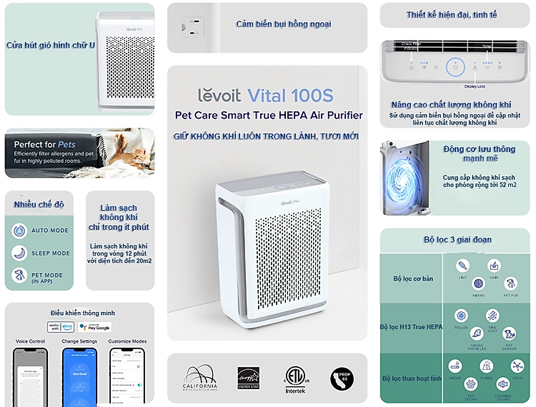 Máy lọc không khí Levoit Vital 100S, phiên bản máy lọc thông minh không chỉ sở hữu một thiết kế hiện đại, bắt mắt mà còn đủ mạnh mẽ để loại bỏ các tác nhân gây ảnh hưởng xấu tới sức khoẻ. Với quy trình lọc ba bước của máy lọc không khí Levoit thì ngay cả những hạt bụi siêu nhỏ cũng sẽ được loại bỏ hoàn toàn trong những không gian lên đến 52m2.