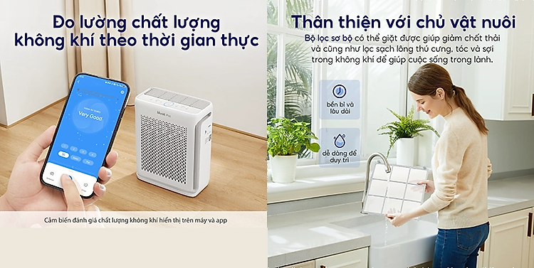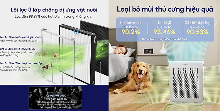 Trong đó, lớp lọc sơ sẽ giữ lại các loại xơ vải, sợi vải, tóc và lông thú. Lớp lọc H13 True HEPA được cải tiến bằng sợi tĩnh điện sẽ loại bỏ 99,97% các hạt có kích thước siêu nhỏ như bụi mịn, phấn hoa,ớp lọc than hoạt tính cuối cùng sẽ loại bỏ và trung hoà các loại mùi hôi, khói, hợp chất dễ bay hơi để mang tới bầu không khí trong lành.