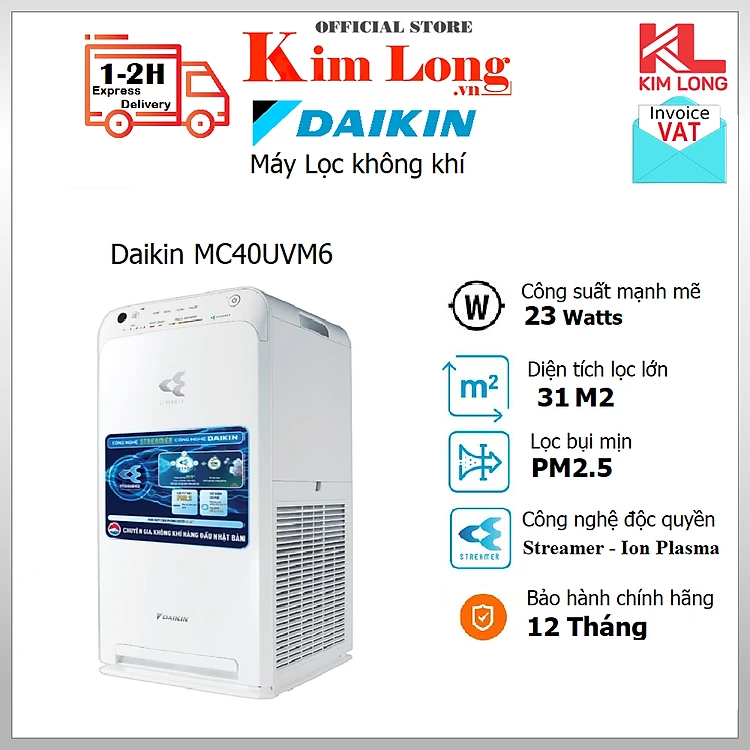 Máy lọc không khí Daikin MC40UVM6-7 - Diện tích 30m2, ion Plasma, Lọc bụi mịn PM 2.5, khử mùi - Hàng chính hãng