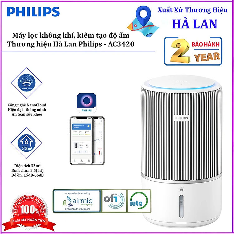 Máy lọc không khí kiêm tạo độ ẩm 2 trong 1, công nghệ hiện đại NanoCloud Serial Series 3400. Thương hiệu Hà Lan cao cấp Philips - AC3420. HÀNG CHÍNH HÃNG