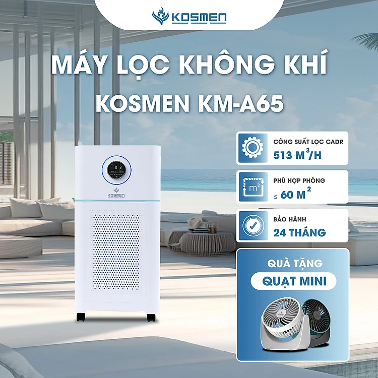 Máy Lọc Không Khí Kosmen KM - A65 Lọc Bằng Ion âm, Diệt Khuẩn Bằng Đèn UV, Khóa Trẻ Em - Hàng Chính Hãng BH 24 Tháng