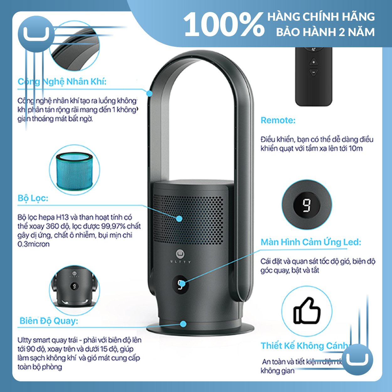 - Sở hữu 3 công nghệ hiện đại bậc nhất hiện nay: tăng áp tua bin, bội khí, tản nhiệt 4D, kết hợp cùng động cơ DC không chổi than mạnh mẽ, Ultty Smart tạo ra tốc độ gió lên tới 4,5 m/s (tương đương 16,2 km/h) – tốc độ gió cao nhất trong các dòng quạt không cánh hiện nay.
