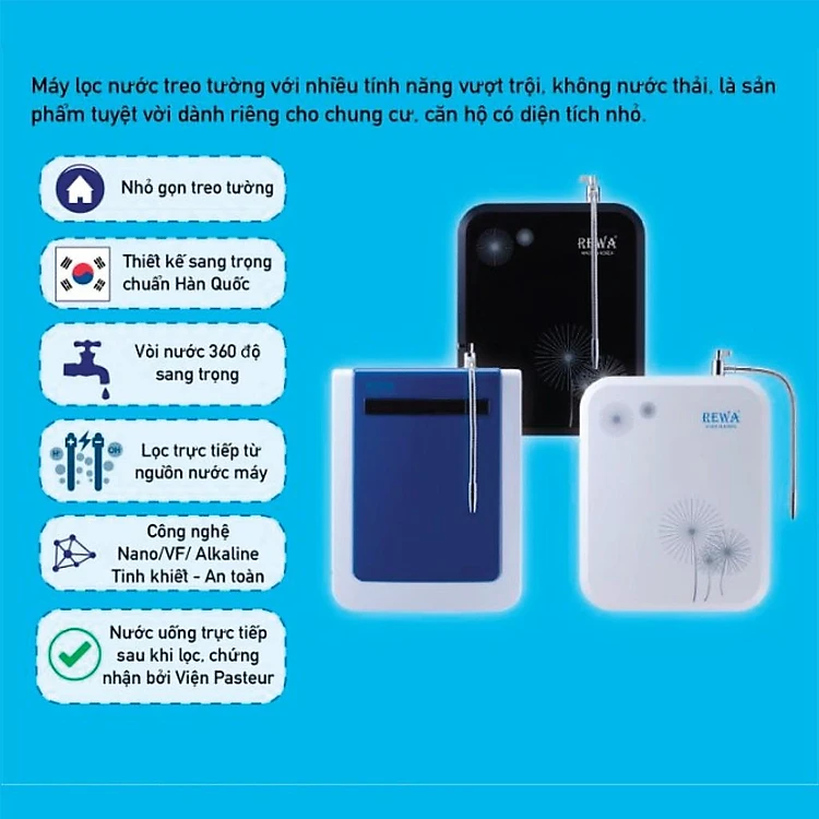 Máy Lọc Nước Treo Tường Rewa được sử dụng công nghệ lọc VF 4 cấp hiện đại, với lõi màng VF có kích thước khe lọc siêu nhỏ có khả năng lọc sạch bụi bẩn, vi khuẩn và kim loại nặng, đảm bảo nước đầu ra theo tiêu chuẩn của BYT ban hành, mang đến cho gia đình bạn nguồn nước lọc tinh khiết, giữ được vị ngọt tự nhiên, an toàn cho sức khỏe.